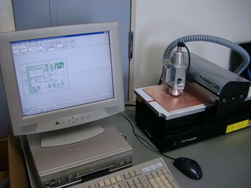 LSIや抵抗,コンデンサ等を半田付けするための プリント基板を試作する機械です。 手作りで作るよりも接触不良などが起こりにくく, 何枚も同じ基盤を作ることができますが, 1枚加工するのに30分から1時間かかります。